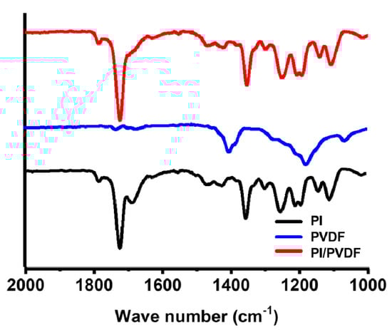Figure 1. FTIR (Fourier transform infrared) spectra of PI (aromatic polyimide), PVDF (polyvinylidene fluoride), and PI/PVDF.