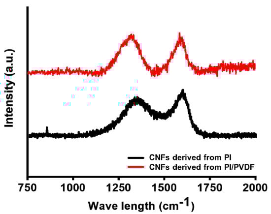 Electrospun PI and PI/PVDF were stabilized and carbonized to produce CNFs, and their carbon microstructures were observed by Raman spectroscopy, as shown in Figure 4. Both carbonized PI and PI/PVDF nanofibers show two significant peaks around 1340 cm−1 (D-band) and 1590 cm−1 (G-band). It is known that D-band and G-band represent the presence of disordered carbon and oriented graphitic carbon, respectively [39]. The relative intensity ratio of the D-band to the G-band (ID/IG) was also measured, and PI/PVDF-derived CNFs show a lower ID/IG ratio of 1.7 than that of PI-derived CNFs (1.9), which means that more ordered carbon is formed in PI/PVDF-derived CNFs.