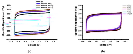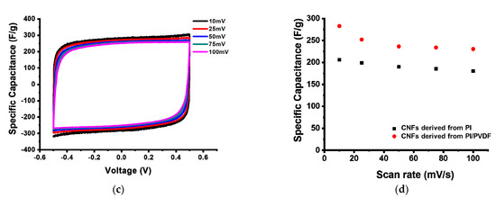 Figure 6b,c show the CVs of CNFs derived from PI and PVDF/PI (90:10) with different scan rates, respectively. At high scan rates, the interaction between the electrolyte ions and the electrode surfaces and pores is limited, resulting in low specific capacitances [44]. Itt is shown that PI/PVDF-derived CNF electrodes exhibit significantly higher capacitances than PI-derived ones for all scan rates, as shown in Figure 6d.
