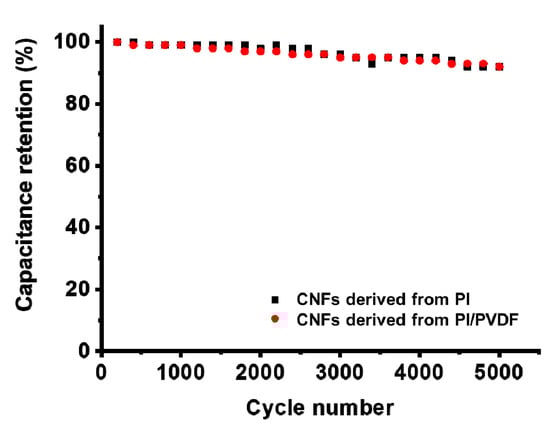 One of the great advantages of supercapacitors is their long cycle life, since they store charges physically in the electrochemical double layers formed at the electrode surface without irreversible redox reactions [45]. In Figure 7, the cycling stability of CNFs derived from PI and PI/PVDF was evaluated by measuring the specific capacitance at 100 mV/s for every 100 cycles, and both exhibit a high capacitance retention of 92% after 5000 cycles. A high degree of reversibility demonstrates the stable cyclic performance of these CNF electrodes.
