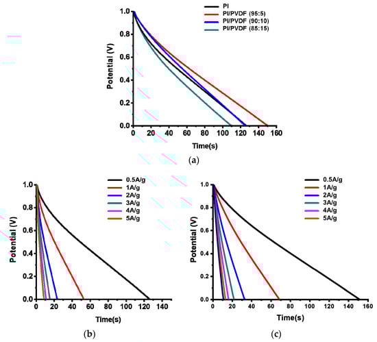 Figure 8b,c show the discharge curves of CNFs derived from PI and PI/PVDF, respectively, over a current density range of 0.5–5 A/g. It is apparent that CNFs derived from PI/PVDF have higher energy densities due to the longer discharge times than those from PI only (8.9 Wh/kg at 0.5 A/g).