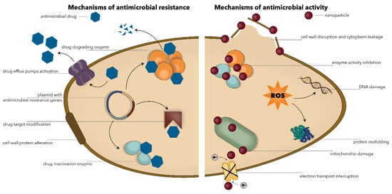 Schematic representation of the main mechanisms involved in the antimicrobial resistance (left) and the antimicrobial activity of nanoparticles (right).