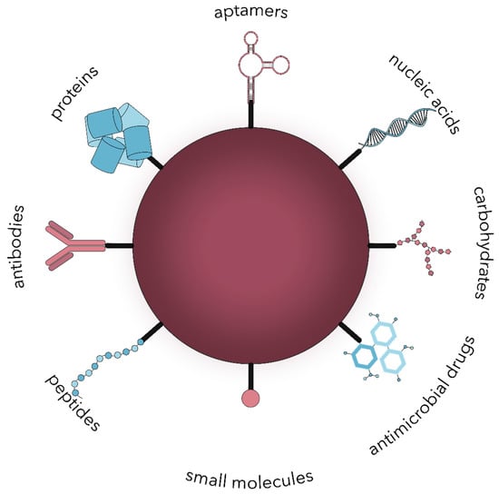 Nanoparticles can target microbial cells through two general possibilities, namely passive or active targeting [39]. On one hand, passive targeting is associated with the accumulation of nanoparticles at the infection site due to a higher vascular permeability and impaired lymphatic system functioning, leading to prolonged drug retention [39,40,41]. This type of delivery is directly influenced by several factors, including hydrophobicity, van der Waals forces, and static electric attraction. Its potency can be increased with the electrostatic interactions between the negative charge of the bacteria surface and the cationic charge of the nanoparticle surface [40,42]. On the other hand, active targeting is a widely employed phenomenon based on the conjugation of active molecules onto the surface of nanoparticles that will specifically bind to the surface molecules overexpressed by microbial cells, such as polysaccharides, proteins, or lipids [39,40,43,44,45]. In this manner, a wide variety of functional groups and molecules or stimuli-responsive ligands can be attached through chemical, physical, or biological methods [35]. Active targeting is an advantageous method to improve the therapeutic index by increasing the selectivity and recognition properties of nanoparticles and consequently reaching higher concentrations at the specific infection site in shorter periods. Thereby, side effects and their associated socio-economic costs are considerably reduced [34,35,43,44]. Nonetheless, active targeting nanoparticles’ design should ensure an appropriate balance between the interaction strength, the release rate, and the conjugate stability [39]. Common biomolecules used as moieties for active targeting include small molecules, peptides, antibodies, nanobodies, proteins, nucleic acids, carbohydrates, and antimicrobial drugs (Figure 2) [34,35,36,39,40,41,43,46,47,48].