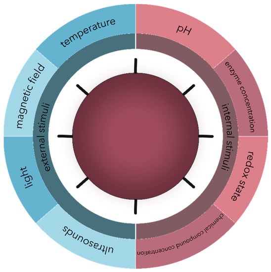 The main types of external and internal stimuli are involved in the controlled release of drug delivery nanosystems.