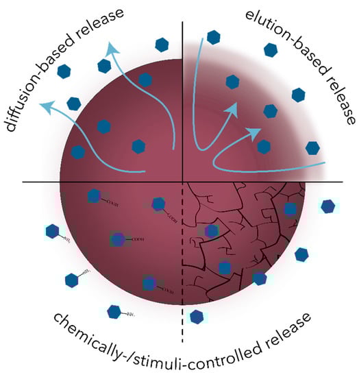 After administration, conventional antimicrobial drugs are distributed throughout the body via bloodstream, where a considerable percentage of the drug undergoes rapid clearance and inactivation. By contrast, drug-carrying nanosystems have the capacity to stay in the circulatory system for longer time periods and specifically target the tissue of interest. In this manner, an appropriate drug dose is administered, thus reducing the plasma fluctuations and the associated adverse effects. Furthermore, the nanoscale of these systems allows for an improved penetration through the tissue barriers while ensuring the protection of the drug until cellular uptake and targeted release [102,103,105,106]. The main mechanisms involved in the controlled release of antimicrobial drugs include diffusion-based, elution-based, and chemically- or stimuli-controlled release (Figure 4) [105].