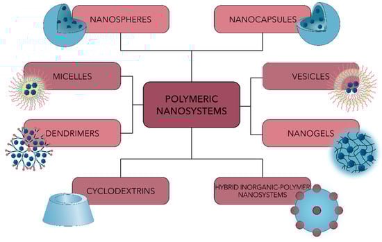 Polymeric nanosystems can be synthesized from a variety of natural or synthetic precursors, such as collagen, chitosan, gelatin, or albumin, and polyethylene glycol, polylactic acid, poly(lactic-co-glycolic acid) (PLGA), polylactic acid (PLA) or polycaprolactone (PCL), respectively [42,108,109]. Additionally, they can be developed in multiple forms, including nanoparticles, micelles, vesicles, dendrimers, or hybrid inorganic–polymer nanosystems (Figure 5) [17].