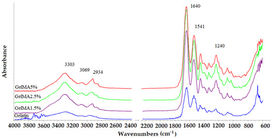 The GelMA spectrum showed peaks at 1640, 1541, and 1240 cm−1 related to the C=O stretching (amide I), N-H bending (amide II), and C-N stretching plus N-H bending (amide III) [33,34], respectively. Moreover, a N-H stretching (amide A) could be observed at 3303 cm−1, as well as a stretching vibration of CH at 2934 cm−1 corresponding to the symmetric and asymmetric stretching in the CH2 groups of alkyl chains (Figure 3) [31,32,33,35,36].