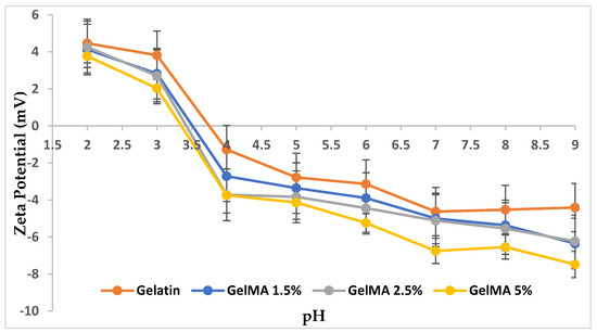 Isoelectric points (IPs) of gelatin and GelMA with different degrees of methacrylation were determined by the DLS technique, monitoring the variations in zeta potential of samples in different pH media. Thus, different solutions consisting of a 1 mg/mL concentration of gelatin, GelMA 1.5%, GelMA 2.5%, and GelMA 5% in saline solution (1 mM NaCl) were subjected to analysis. Samples were introduced in a ZETASIZER instrument (Zetasizer Nano ZS Malvern Instrument, Worcestershire, UK) and were measured at different pH values, ranging from 2 to 8, at 25 °C in three cycles, each cycle with 50 measurements. All the measurements were performed in triplicate.