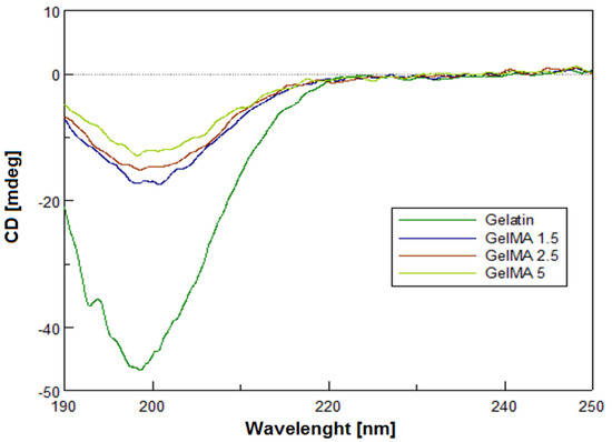 The GelMA structure was studied in order to observe if the secondary structure of gelatin was preserved during the methacrylation reaction and if the methacryloyl functionalization of GelMA interfered with helix formation. The CD spectra registered for the obtained samples are presented in Figure 5.