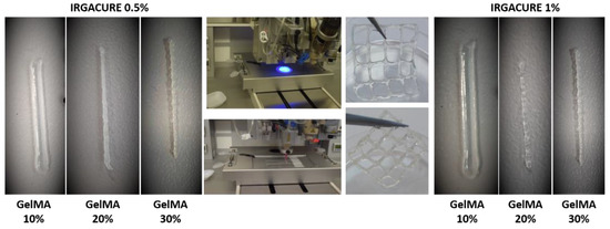 First, hydrogels with 10% GelMA and 0.5% or 1% I-2959 were prepared and subjected to the additive manufacturing process. The low concentration of GelMA leads to low viscosities of the bio-inks inducing instability during the extrusion process; therefore, irregular shapes of the filament were obtained. In addition, the gelatin filaments were larger and spread more than GelMA 20% and GelMA 30% after they came into contact with the glass slides surface on which they were printed.
