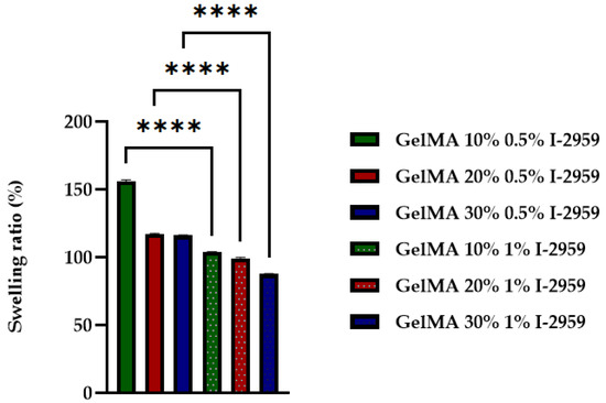 Swelling ratio of GelMA-based hydrogel with different concentrations of GelMA and I-2959. Statistical significance: **** p < 0.0001.