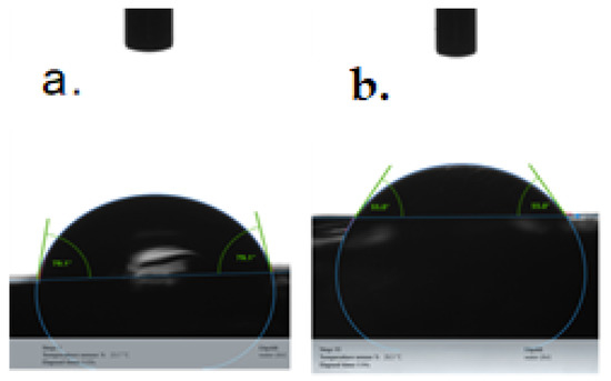 Both GelMA-based scaffolds presented a hydrophilic character, regardless of the amount of photoinitiator, namely: 55.45° ± 0.4 for GelMA20% + 0.5% I-2959 and 78.84° ± 0.27 for GelMA 20% + 1% I-2959) (Figure 10). However, the hydrophilicity of the biomaterial decreased with the concentration of the photoinitiator. This effect can be explained by the presence in the system of a high number of centers that initiate the photocuring process, determining the formation of a denser crosslinking network, and a less hydrophilic system.
