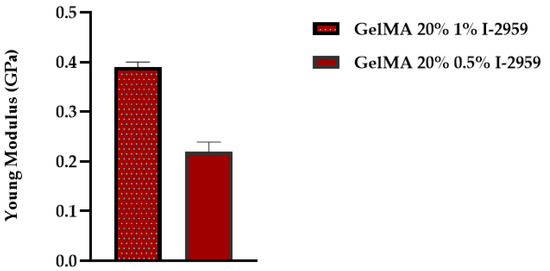 The results proved that the concentration of the photo initiator is of great importance when we target the improvement in mechanical properties of a material. A value of E = 0.393 ± 0.01 GPa was obtained for GelMA with 1% I-2959, while the value of Young’s modulus determined for GelMA hydrogels with 0.5% I-2959 was approximately 45% lower (E = 0.22 ± 0.019 GPa).