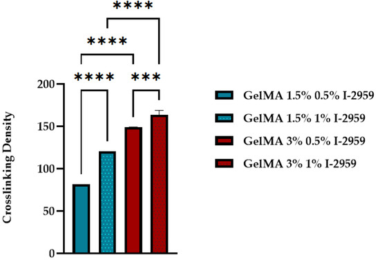 Crosslinking density of GelMA with different degrees of methacrylation and different concentrations of photoinitiator. Statistical significance: *** p < 0.0005; **** p < 0.0001.