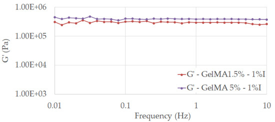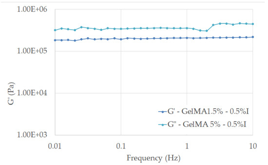 Storage modulus of crosslinked hydrogels based on 1.5% GelMA with 0.5% I and 5% GelMA with 0.5% I as functions of frequency measured at 25 °C under a stress of 5 Pa.
