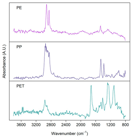 Imaging-FTIR can be operated in reflection or transmission mode [48]. Generally, the transmission mode is more suitable for smaller particles, as larger and thicker particles heavily absorb the incident radiation. Reflection mode, on the other hand, suffers from variations in morphologies [49]. Figure 2 shows examples of FTIR spectra measured with the FPA detector in reflection mode for some common MP samples [50] from a real environment separated from biota samples showing clear distinction among the spectra for PE, PP, and PET, especially at higher wavenumber.