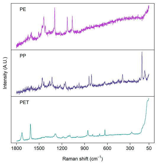 Examples of Raman spectra of microplastics measured from environmental samples: polyethylene (PE), polypropylene (PP), and polyethylene terephthalate (PET). Samples were measured with a 785 nm laser from aluminum oxide (Anodisc) filters.