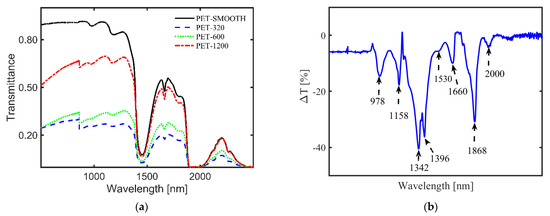 Although not a fully developed identification method for MPs, like in the case of the other two methods, NIR transmission of MPs provides other useful information on MPs. For example, one can monitor the surface roughness and its time-dependent change, which can serve as a measure for the residence time of MPs in aquatic environments [85]. Moreover, transparent, translucent, and MPs with surface roughness can be differentiated from one another in water by measuring their transmittance [24,84]. Figure 4a illustrates an example of transmittance of thin-film PET samples with different roughness in water [24], showing a nonlinear dependence with the average surface roughness [22]. Additionally, for different MP types in a complex matrix, similar identification and classification based on spectra libraries, as in the case of FTIR and Raman, can be obtained via peak attribution of the weighted spectra. Figure 4b illustrates the difference in transmittance (ΔT) spectra for pure ethanol and ethanol with different environmental MPs suspended in it (FEMPs), where some dips in the curve, namely 1158 nm, 1396 nm, and 1660 nm, have been attributed to the PS, PE, and PET, respectively, in comparison to the studies in [84,86]. Thus, the difference in transmittance allows immediate authentication of characteristic peaks of certain plastics in an extremely complex environment, which are otherwise absent in the conventional transmittance of FEMPs. In the case of in situ detection of arbitrary MPs or mesoplastics in water, analytical tools such as Kramers–Kronig light dispersion relation can be convenient for the identification of the plastic type and surface properties [25]. Thus, the existence of a transmission spectra library of MPs under varied and complex conditions can prove very useful for the identification of aquatic MPs using this method. In particular, the use of classification techniques such as PCA [87] could be beneficial to MP identification.