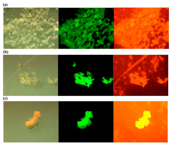 Photos under a microscope (left), a fluorescence microscope with excitation and emission wavelength of 534–558 and 515–565 nm (middle); and 534–558 and >590 nm (right) for the Nile Red stained low density (a) polyethylene (LDPE); (b) polypropylene (PP); (c) expanded polystyrene (EPS) Reprinted from Marine Pollution Bulletin, 113, Shim, W.J.; Song, Y.K.; Hong, S.H.; Jang, M., Identification and Quantification of Microplastics Using Nile Red Staining, 469–476. [93], Copyright (2016), with permission from Elsevier.