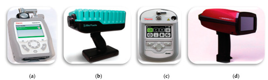 Portable devices: (a) FTIR—Thermo Fisher Scientific; (b) Raman—BioTools RamTest; (c) Gemini-combined Raman and FT-IR handheld analyzer—Thermo Fisher Scientific; (d) HI-BaySpec’s GoldenEye. Reprinted from Applied Spectroscopy, 72, Crocombe, R.A. Portable Spectroscopy, 1701–1751. [69], Copyright (2018), with permission from SAGE Publications