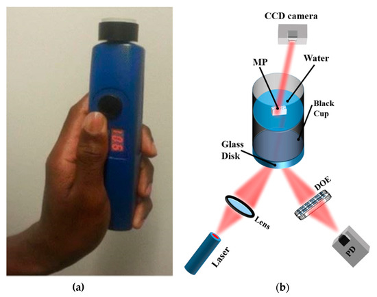 (a) Image of a handheld optical sensor for MP detection [117]; (b) optical measurement setup. The diffractive optical element (DOE) spatially filters the reflected light signal to obtain the specular component of the light signal on the photodiode (PD). The speckle pattern is measured by the CCD camera Reprinted from Chemosphere, 254, Asamoah, B.O.; Roussey, M.; Peiponen, K. On Optical Sensing of Surface Roughness of Flat and Curved Microplastics in Water, 126789. [23], Copyright (2020), with permission from Elsevier.
