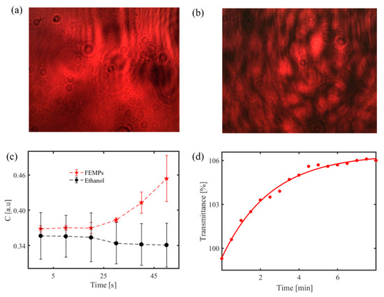 (a) Recorded interference pattern for transparent and smooth PET MP [21]; speckle pattern of similar MP with a rough surface [23]; (b) using the handheld optical sensor. Identification of MPs in ethanol; (c) time-dependent speckle contrast calculated for pure ethanol only and ethanol-containing MPs (FEMPs) on a rough glass disk using a handheld optical sensor; (d) time-dependent transmittance signal from ethanol containing MPs at a fixed wavelength (800 nm) using a spectrophotometer. Figure 9a Reprinted from Chemosphere, 231, Asamoah, B.O.; Kanyathare, B.; Roussey, M.; Peiponen, K.E. A Prototype of a Portable Optical Sensor for the Detection of Transparent and Translucent Microplastics in Freshwater, 161–167. [21], Copyright (2019), with permission from Elsevier; Figure 9b Reprinted from Chemosphere, 254, Asamoah, B.O.; Roussey, M.; Peiponen, K. On Optical Sensing of Surface Roughness of Flat and Curved Microplastics in Water, 126789. [23], Copyright (2020), with permission from Elsevier.