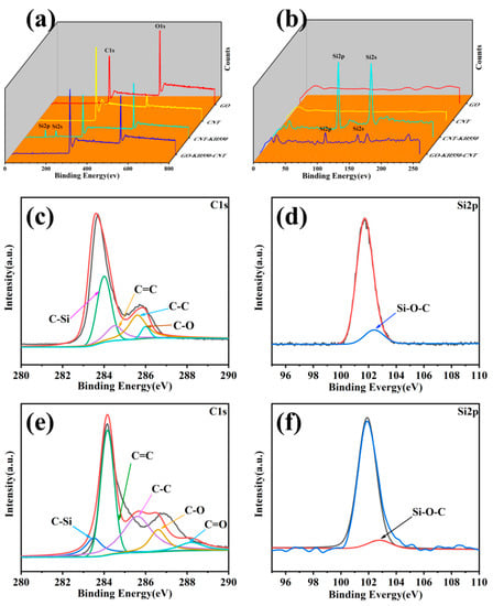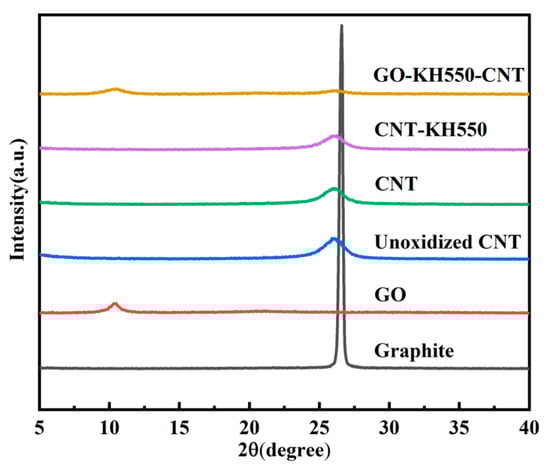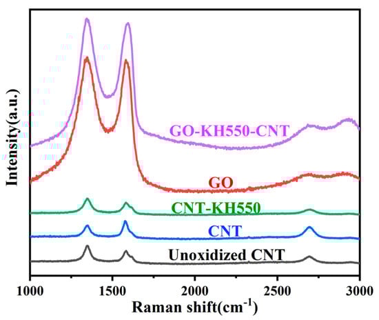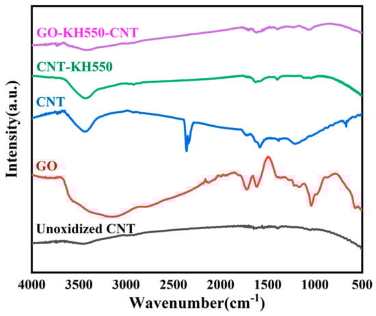 3.1. Chemical Composition and Morphology of GO, CNT, CNT-KH550, and GO-CNT