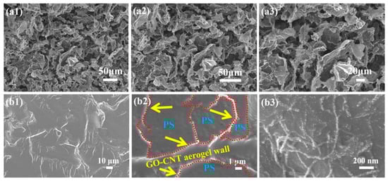3.2. Morphology and Dispersion of GO-CNT Aerogel and GO-CNTA/PS Nanocomposites