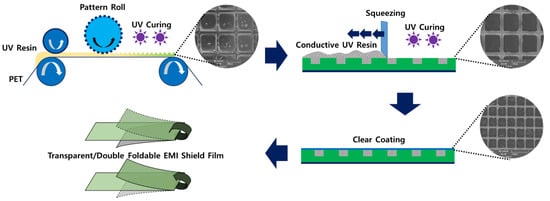 In this study, an UV imprinting technology was used to manufacture an EMI shielding film that comprises a transparent/flexible structure. The intaglio pattern was designed in the opposite direction to that of the existing pattern, and it was possible to achieve an economical manufacturing process by applying the soft molding technique. It was confirmed that a difference in conductivity occurred depending on the structure of the particles, and an optimized particle was selected to form a pattern. Various designs were fabricated and different patterns were optimized for maximum performance and mass production. By adopting the intaglio structure, it was possible to stably fix the conductive particles; accordingly, excellent bending characteristics were obtained. Previous studies have indicated that the imprinting process involves expensive technologies; however, this study clearly exhibited that it is possible to develop an imprinting technology that is inexpensive and capable of mass production. Through research related to the entire process including material design, pattern design, introduction, and evaluation of mass production technology, it was possible to propose industrially applicable film processing technology. Therefore, it is expected that this novel process will be universally used to design parts for next-generation devices such as electronic wearables.