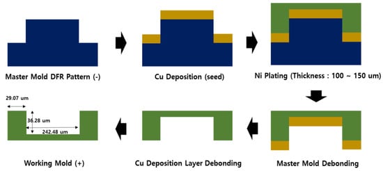Manufacturing process of working pattern mold for imprinting. Blue—master pattern, Yellow—copper coating, Green—nickel plating.