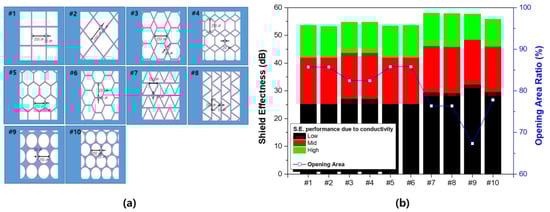 Various types of pattern designs were designed and the shielding characteristics and transmittance of each design were compared. This is to implement transparent/shielding characteristics at the same time and to review suitability in the actual mass production process. Since the process of making an actual pattern is very complex, we tried to examine each performance in advance through simulation and select a structure suitable for actual manufacturing. Figure 4 is the width of the open space was fixed at 250 μm and the line width of the pattern was fixed at 20 μm; subsequently, 10 different patterns were designed. The patterns exhibiting excellent electromagnetic wave shielding performance (#7 and #8) tended to show inferior optical properties. Samples with high aperture ratios exhibited no significant differences, even with regard to the actual shielding ratio (#1, #2, #5, and #6.).
