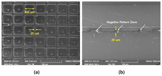 Among the structures demonstrating the same aperture and shielding ratios, #1 and #2 were considered to represent the best pattern structure; this is because the smaller the pattern contact, the higher the structural stability of the pattern formation. Based on the simulation results, a pattern with a square structure was designed. The structure of the manufactured pattern is shown in Figure 5, and it can be confirmed that a region with a negative pattern was formed.
