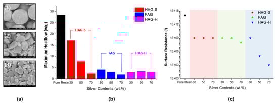 In order to maximize the shielding performance, conductivity must be increased. It is generally known that metals afford low resistances, particularly silver and copper (Table 2). The relative ease of controlling the shapes of silver particles renders them extremely suitable for the construction of composite materials. In this study, the conductivity and curing properties were verified by using three types of particles, namely: spherical-type particle (HAG-100S, Changsung, Korea), plate-type particle (FAG-100S, Changsung, Korea), and laminated-type particle (HAG-100H, Changsung, Korea).