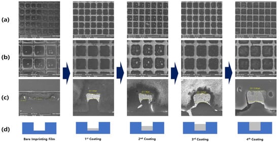 Figure 7 represents the scanning electron microscope image of a structure, in which a transparent film with am imprinted pattern and a conductive binder are layered in steps. A and B are the photographs taken from the top of the binder that is laminated on the structure with a negative pattern; C and D represent the measurement results of the cross section during the lamination process. When filling a structure that comprises a fine gap, a limited amount of filler can be added at a time. This structure exhibits a high viscosity and certain areas remained unfilled because of the presence of particles. Therefore, it was gradually filled through a continuous process. Coating processes were conducted four times in total, and the filling state and associated characteristics were examined in each step. It can be confirmed in each image that the filling amount of the conductive binder increases as the coating progresses.
