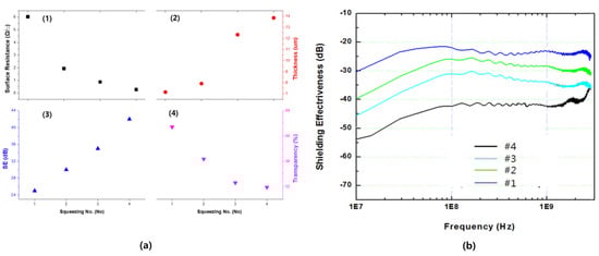 Evaluation of film properties and electromagnetic shielding properties according to coating conditions. (a) Main performance evaluation result by number of squeezing. 1: Surface resistance, 2: filling thickness, 3: shielding effectiveness at 1 GHz, and 4: transparency. (b) Shielding effectiveness change according to frequency change.