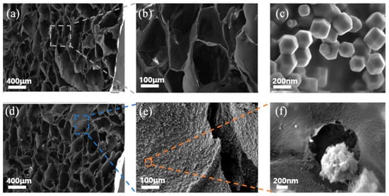 Scanning electron microscopy (SEM) image of (a,b) GEL; (c) ZIF-67; (d–f) Co-ZIF@GEL.