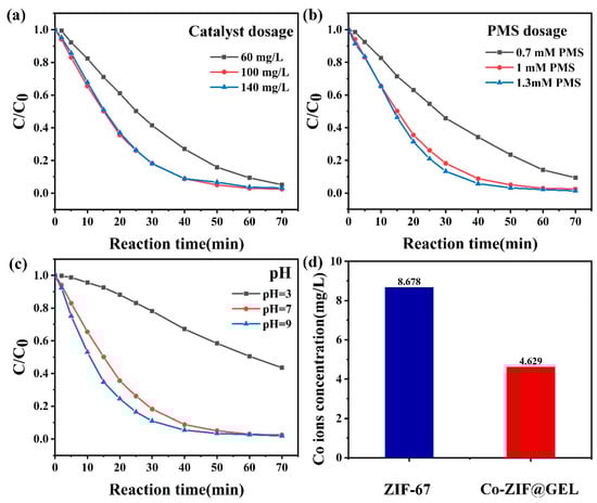 (a) The amount of catalyst (PMS = 1 mM) (b) The influence of PMS concentration (catalyst = 100 mg/L) on the degradation of PNP (c) The influence of initial pH on the reaction (d) The dissolution of cobalt ion after the reaction Contrast (conditions: ZIF-67 = 50 mg/L, Co-ZIF@GEL = 100 mg/L, PMS = 1 mM, PNP = 10 mg/L, T = 25 °C;).