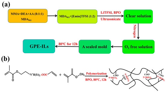 Ionically cross-linked gel networks were formed by copolymerization of MMA, DEA, and AA. The synthesis was completed via following steps: 1. 1 mL DEA and 1 mL AA were added into 8 mL MMA solution in order to form a mixture of MDA. 2. Ionic liquid [Emim]TFSI and MDA were mixed uniformly with a volume ratio of 2:1. 3. Then, 10 mg BPO, serving as an initiator, and a certain amount of LiTFSI was added to the [Emim]TFSI and MDA mixture. 4. This mixture were ultrasonicated for 1.5 h until the mixture changes to a clear and transparent solution. 5. The solution was bubbled with nitrogen for 30 min to ensure an O2-free environment, and then, the remaining gas dissolved in the system was exhausted. 6. This O2-free solution was transferred to a sealed mold composed of two pieces of FTO glass. 7. This mold was then heat treated at 80 °C for 12 h (Figure 1a). The major reaction can be illustrated as two steps: protonation process of DEA and AA and the process of free radical bulk polymerization (Figure 1b). Finally, a free-standing GPE-ILs film was obtained.