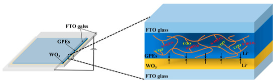 ECDs with a sandwich structure of glass/FTO/WO3/GPEs-ILs/FTO/glass were assembled by adding GPE-ILs in between a WO3-coated FTO glass and a bare FTO glass, which is as shown in Figure 2.