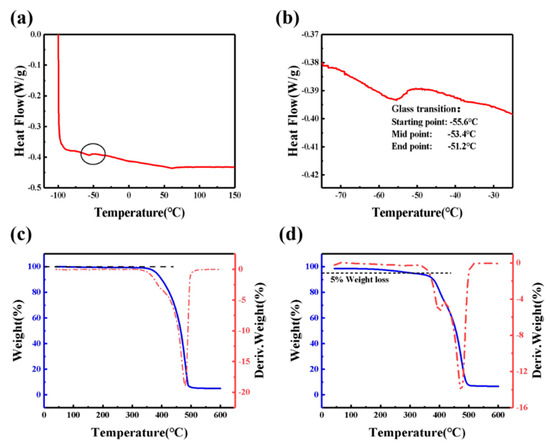 (a) Differential scanning calorimetry (DSC) thermograms for GPE-ILs over the temperature range from −100 to 150 °C at a heating rate of 10 °C min−1. (b) Enlarged view of area for glass transition. TGA and its DTG curve of (c) [Emim]TFSI and (d) GPE-ILs.