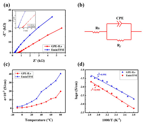 Figure 4a shows the AC impedance spectrum of [Emim]TFSI and GPE-ILs at 25 °C, an equivalent circuit as shown in Figure 4b is applied to fit experimental results. Therein, Rs represents the bulk resistance; Rf is the interfacial resistance; CPE is the constant phase element. In addition, then the bulk resistance values are fitted by Zview software. The ionic conductivity of the electrolytes was calculated according to Equation (1):