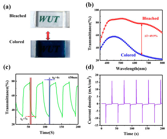 - Yu, H.T.; Shao, S.; Yan, l.j.; Meng, H.; He, y.w.; Yao, C.; Xu, P.P.; Zhang, X.T.; Hu, W.P.; Huang, W. Highly robust and flexible WO3·2H2O/PEDOT films for improved electrochromic performance in near-infrared region. J. Mater. Chem. C 2016, 4, 2269–2273. [Google Scholar] [CrossRef]