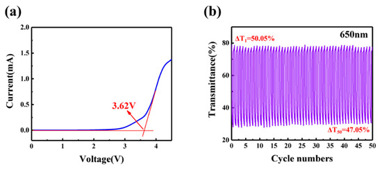(a) Linear sweep voltammetry curve for GPE-ILs. (b) Transmittance of ECD with GPE-ILs at 650 nm for 50 cycles.