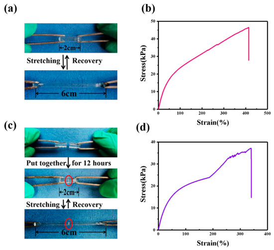 (a) Photographs demonstrating stretching of GPE-ILs. (b) Tensile stress strain of GPE-ILs. (c) Photographs demonstrating self-healing and stretching of GPE-ILs. (d) Tensile stress strain of self-healing GPE-ILs.