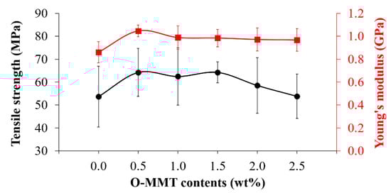 Figure 1 shows the tensile strength and Young’s modulus of the CFRP/O-MMT composites. With the incorporation of O-MMT, the tensile strength of the CFRP increased and reached 64.3 ± 4.6 MPa at 1.5 wt% O-MMT, which was 20% higher than that of the CFRP (53.7 ± 13.2 MPa). More O-MMT loading showed no further increase in the tensile strength because of the agglomeration of O-MMT, as shown by the FE-SEM observation. Besides, the CFRP with all O-MMT contents possessed similar Young’s modulus at 1.0 ± 0.1 GPa, which were 11% higher than that of the CFRP (0.9 ± 0.1 GPa). Jahangiri et al. [11] also achieved similar results, and they stated that the two main reasons for strengthening the polymer matrix with nanoclay particles were the filling of void volumes and the strength of composite reinforced with nanoclay particles.