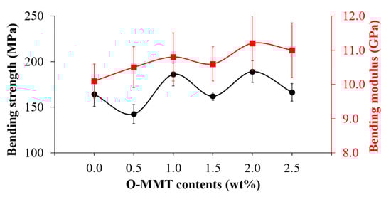 Figure 2 shows the bending strength and bending modulus of the CFRP/O-MMT composites. The bending strength of the CFRP decreased at a low O-MMT content of 0.5 wt%. As the O-MMT loading increased, the bending strength of the CFRP became higher. The CFRP with 2.0 wt% O-MMT gave the highest bending strength of the CFRP (189.0 ± 32.0 MPa), which improved by 15% compared to the CFRP (164.3 ± 28.0 MPa). The bending strength of the CFRP marginally decreased at a higher O-MMT loading. It is noted that the bending strength of the composites can be enhanced by adding O-MMT; however, the relationship between the bending strength and O-MMT content are interfered by the non-uniformity of the composites. Moreover, the bending modulus of the CFRP increased when the O-MMT loading increased. The addition of 2.0 wt% O-MMT offered the highest bending modulus (11.2 ± 0.8 GPa), which improved by 11%, compared to the CFRP (10.1 ± 0.5 GPa). At a high O-MMT content of 2.5 wt%, the bending modulus of the CFRP reduced to some extent. This can be attributed to the enhancement of the chemical bonding between the polymer matrix and the organically modified nanoclay, strengthening the matrix further. However, at higher nanoclay loading, the mechanical locking descended, which caused the decrease in strength and modulus [22].