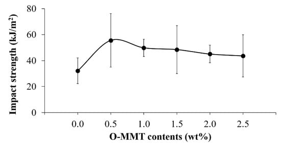Impact resistance is a vital property for all materials, which is the ability of the materials to resist the fracture under sudden impact load [20]. Figure 3 shows the impact strength of the CFRP/O-MMT composites. It was found that the CFRP with 0.5 wt% O-MMT showed the highest impact strength (55.5 ± 20.6 kJ/m2), which improved by 73%, compared to the CFRP (32.2 ± 9.9 kJ/m2). This is explained by the finding that the impact strength of the composites can be efficiently improved by adding the small content of O-MMT as 0.5 wt%, which is different from the results of the tensile and bending testing. Thus, the materials may have responded differently to the different mode of loading. The 0.0% O-MMT is the CFRP composite; it showed its own properties, but once 0.5% O-MMT was added because of its good distribution in the CFRP composite, it could provide the effective toughening mechanism to the composite and higher impact strength was obtained. The good distribution is shown in Figure 8a–c. In Figure 8b, the step structure surface was observed in the matrix phase, which indicates that it is the more ductile characteristic or the tougher material. When the O-MMT loading increased, the impact strength of the CFRP diminished but were still greater than that of the CFRP. This is due to the O-MMT agglomeration at high adding contents. Similar improvement of the impact strength in the nanoclay–polymer composites was also reported recently [27].