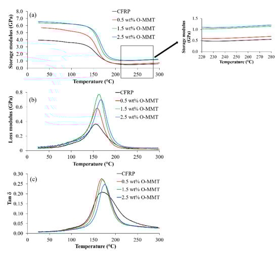 Changes in (a) storage modulus, (b) loss modulus, and (c) tan δ of the CFRP/O-MMT composites with response to temperature.
