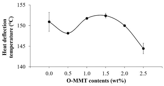 The thermal properties of the CFRP/O-MMT composites were described by heat deflection temperature, which is the temperature at which a polymeric material deforms under a specified load. Figure 6 shows the heat deflection temperature of the CFRP/O-MMT composites. By increasing the O-MMT loading, the heat deflection temperature increased and reached 152.4 ± 1.8 °C at 1.5 wt% O-MMT, which was 1% higher than that of the CFRP (150.9 ± 2.3 °C). As the O-MMT loading further increased, the heat deflection temperature of the CFRP substantially decreased because of its agglomeration. This can be explained by the finding that that the nanoclay had a good thermal resistance property, thus it could improve the thermal properties of the composites. However, the nanoclay could agglomerate at a high adding content, which could possibly cause the formation of the phase of polymer and filler enrichment, as shown in Figure 8i.