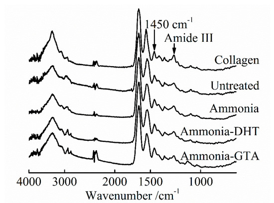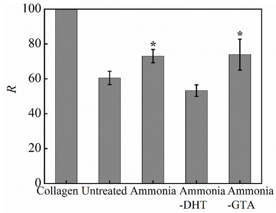 Physical and chemical crosslinking treatments were applied after the application of ammonia treatment. DHT treatment is widely used to improve the properties of collagen-based materials because of its non-cytotoxicity [35,44]. It forms covalent bonds between the collagen peptide chains by condensation reactions under high temperature [34,45]. Compared with the ratio R of ammonia treated collagen tube, ammonia-DHT treated collagen tube had much lower ratio R. It showed that ammonia-DHT treatment aggravated the denaturation due to the high treatment temperature [34]. GTA treatment is a typically chemical crosslinking method which produces the crosslinks through the reaction of the free amine groups of lysine or hydroxylysine amino acids residues of collagen peptide chains with the aldehyde groups of GTA [33,46]. Because the reaction mechanism does not give any effect on the triple helix structure, the collagen tube with ammonia-GTA treatment showed a higher ratio R than that of ammonia-DHT treated collagen tube.